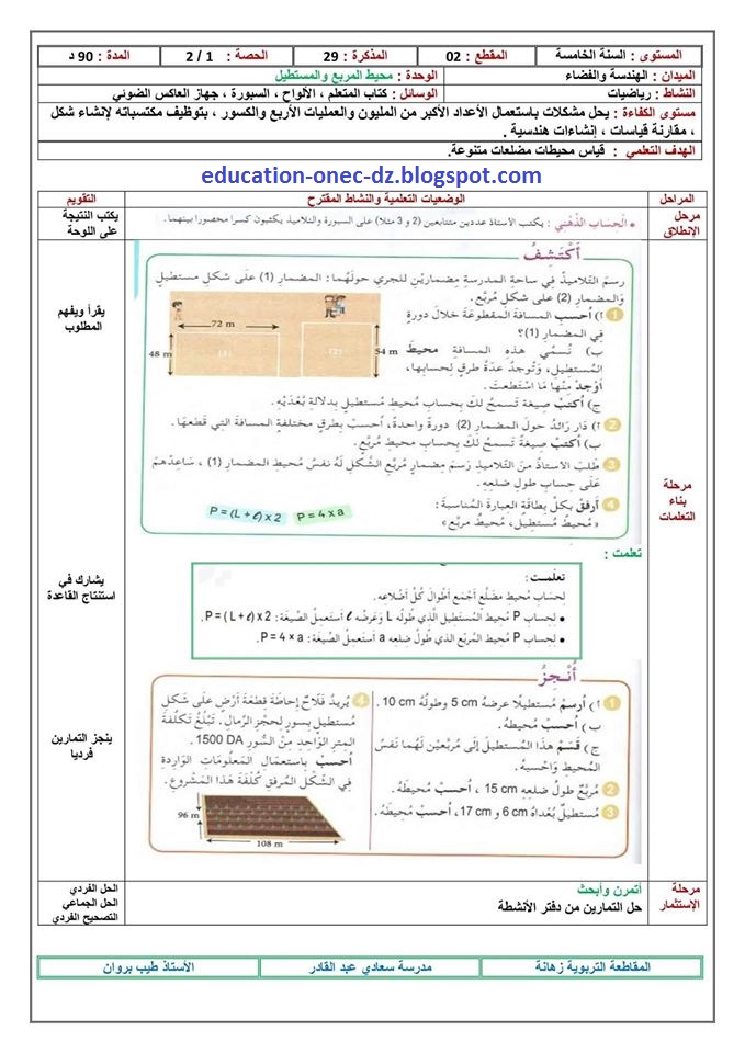 مذكرات درس محيط المربع و المستطيل في مادة الرياضيات للسنة الخامسة ابتدائي المكيفة مع الجيل الثاني
