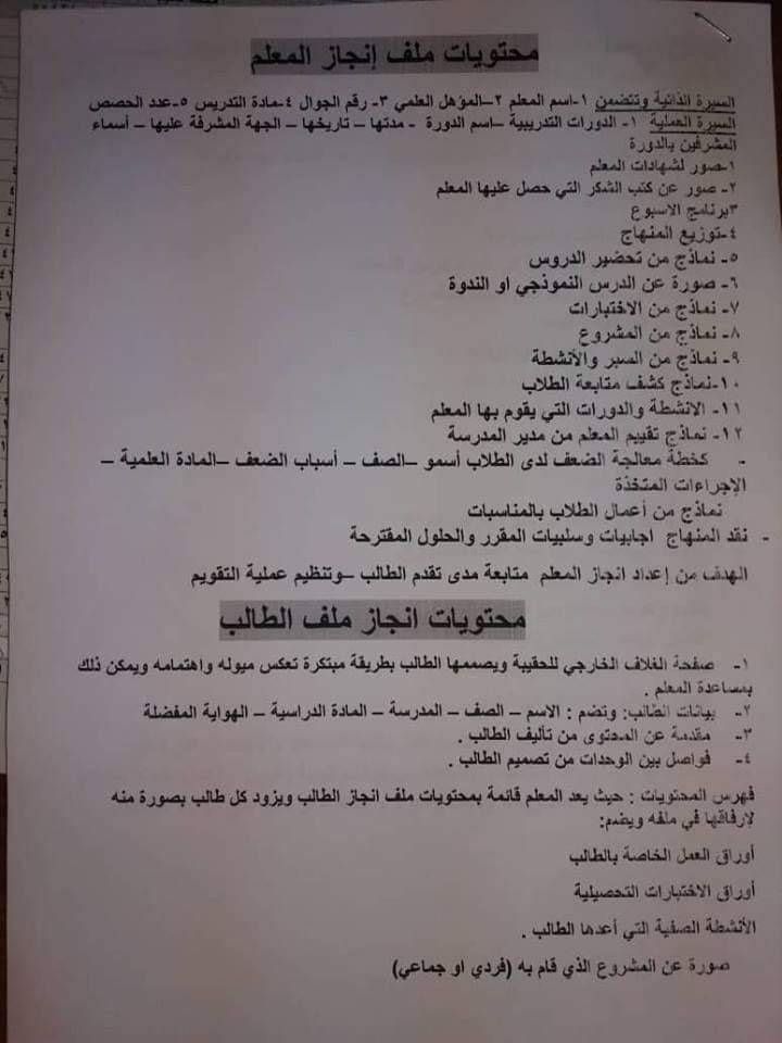 محتويات كل من ملف انجاز المعلم والطالب