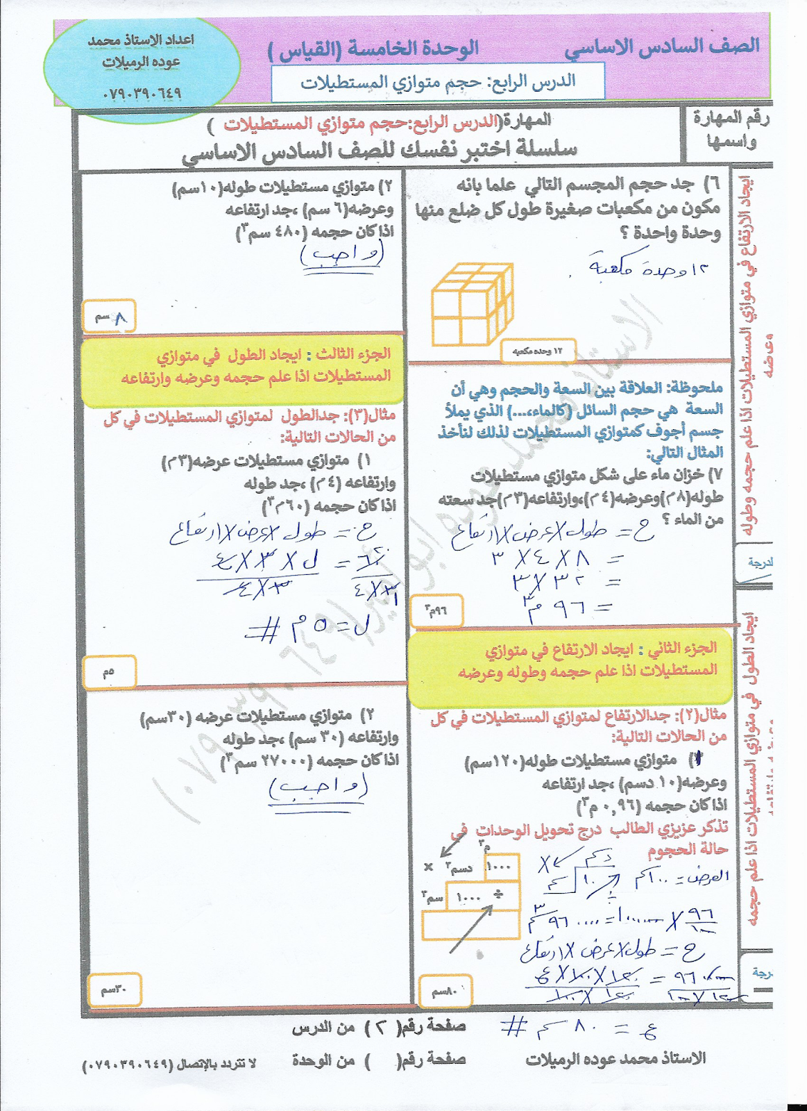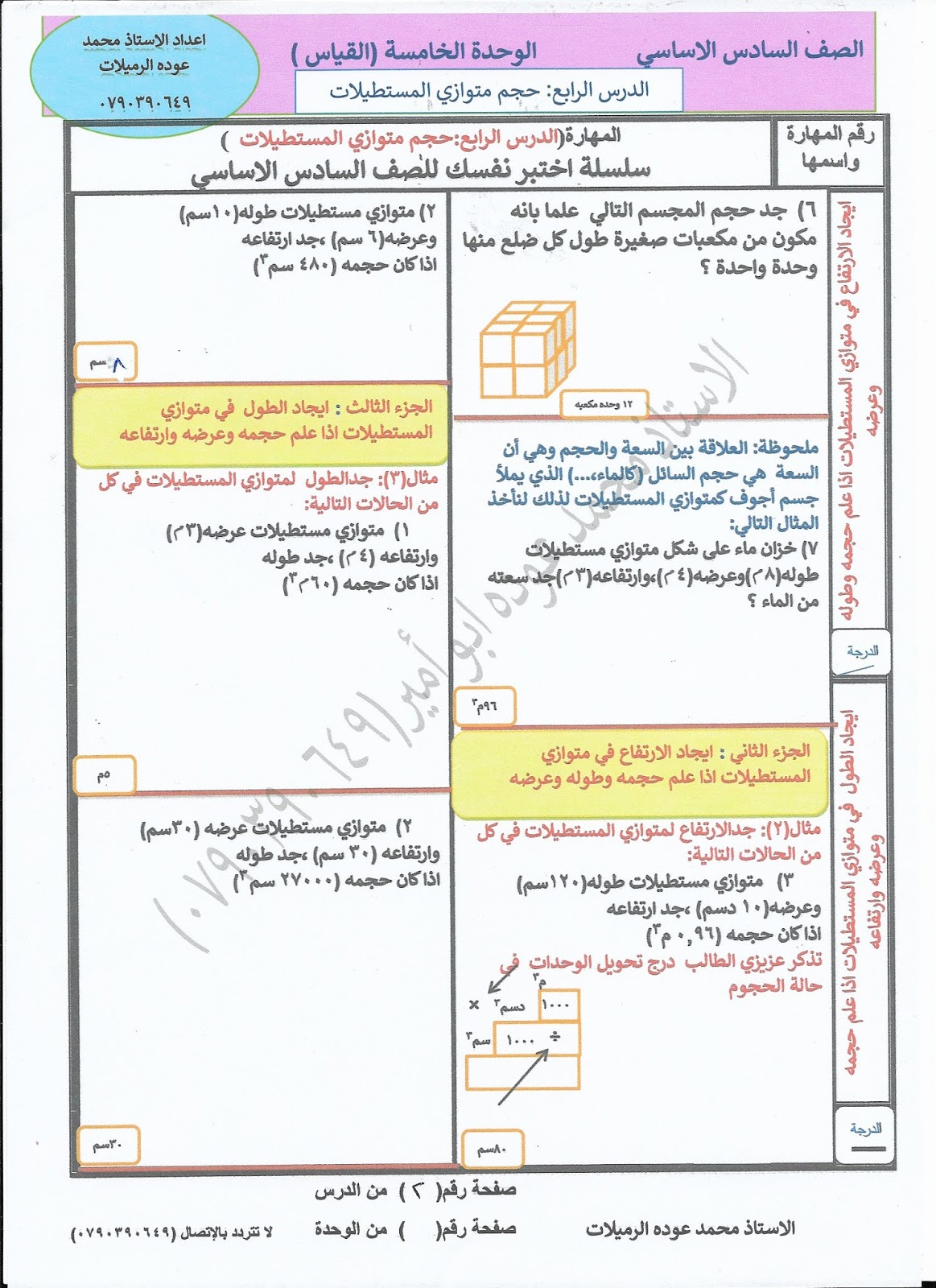 الدرس الرابع حجم متوازي المستطيلات سلسلة اختبر نفسك للصف السادس الاساسي