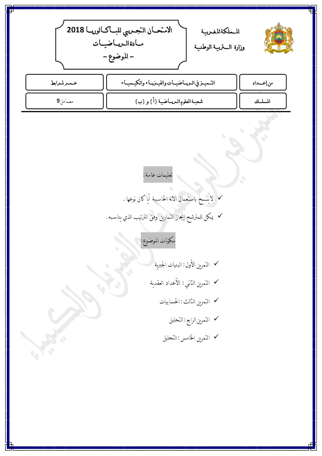 التميز في الرياضيات والفيزياء والكيمياء امتحان موحد تجريبي 2018 مادة الرياضيات شعبة العلوم الرياضية