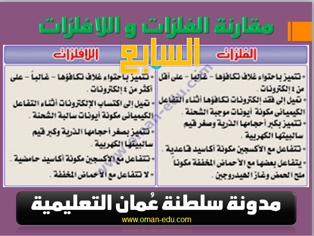 ملخص شرح درس مقارنة بين الفلزات واللافلزات مع حل الأنشطة الصف السابع علوم الفصل الثاني المناهج الع مانية