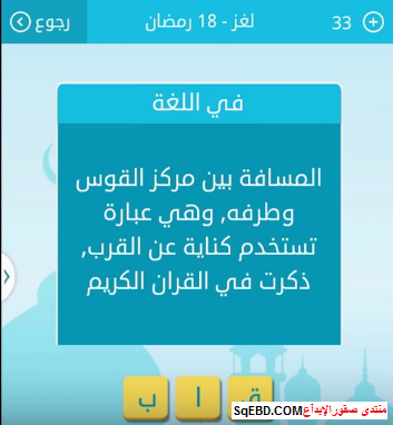 اجابة لغز المسافة بين مركز القوس وطرفه وهي عبارة تستخدم كناية عن القرب ذكرت في القران الكريم من لغ صقور الإبدآع