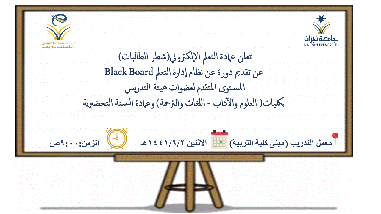 رابط بلاك بورد جامعة نجران يمكننا الانتقال إلى نظام بلاك بورد جامعة نجران من هنا مباشرة لاستكمال كاف ة عناصر العملي ة الت عليمي ة عن بعد خلال الوقت الحالي وذلك للحد من انتشار وباء كورونا في المملكة العربي ة الس عودي ة. الدخول إلى نظام التعلم الالكتروني. كيفية فتح البريد الالكتروني الجامعي للطلبة. تسجيل دخول بلاك بورد جامعة نجران يتم تسجيل الدخول على بلاك بورد جامعة نجران من قبل الطلاب وأعضاء الهيئة التعليمية لمتابعة التعليم.