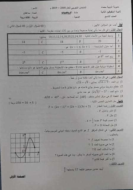 الاختبار التجريبي في الرياضيات للصف التاسع 2018 2019 ثانوية المتفوقين الثانية