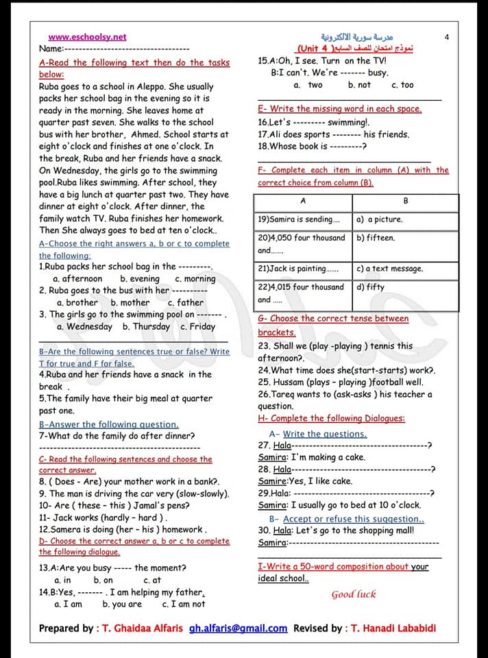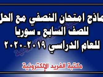 نماذج امتحان النصفي مع الحل للصف السابع سوريا ـ للعام 2019 2020 مكتبة الفريد الإلكترونية