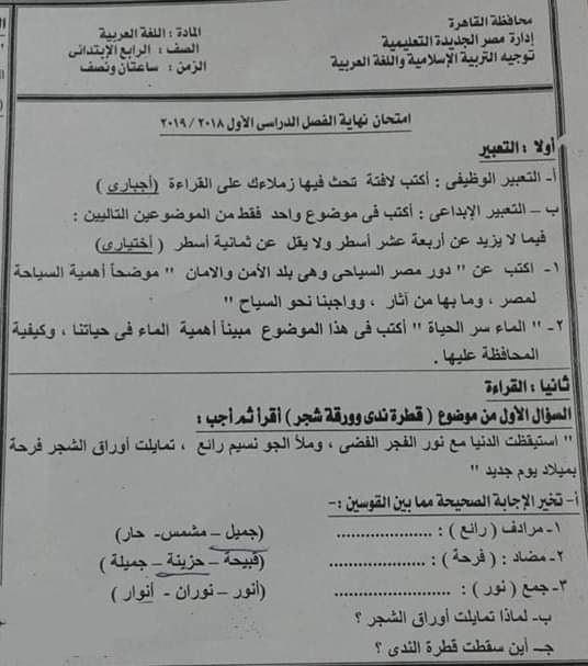 امتحان لغة عربية للصف الرابع الابتدائي ترم أول 2019ادارة مصر الجديدة التعليمية