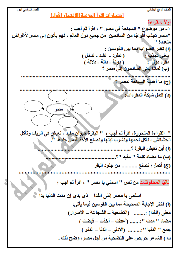 نموذج امتحان لغة عربية للصف الرابع الفصل الاول