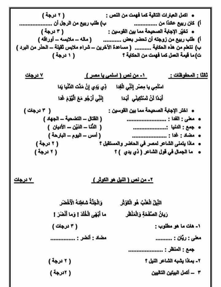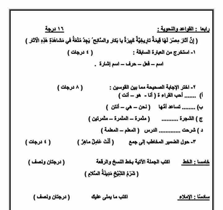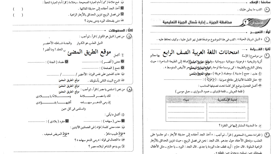 امتحان لغة عربية الصف الرابع الابتدائي 2018