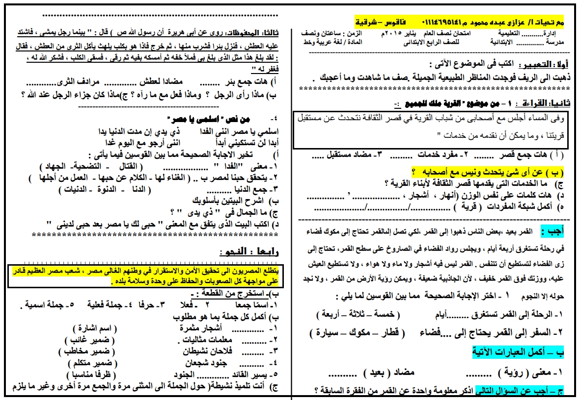 نماذج امتحانات فى اللغة العربيه للصف الرابع الابتدائى شاملة أسئلة القراءة المتحررة الفصل الدراسى الاول 2016 بروفة على النظام الجديد مستر عزازى على عزازى