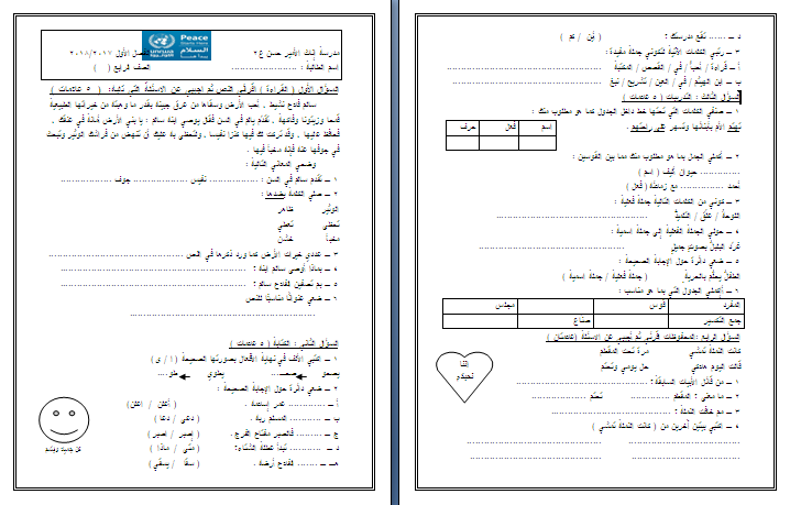 نماذج لامتحان اللغة العربية للصف الرابع الفصل الأول 2017