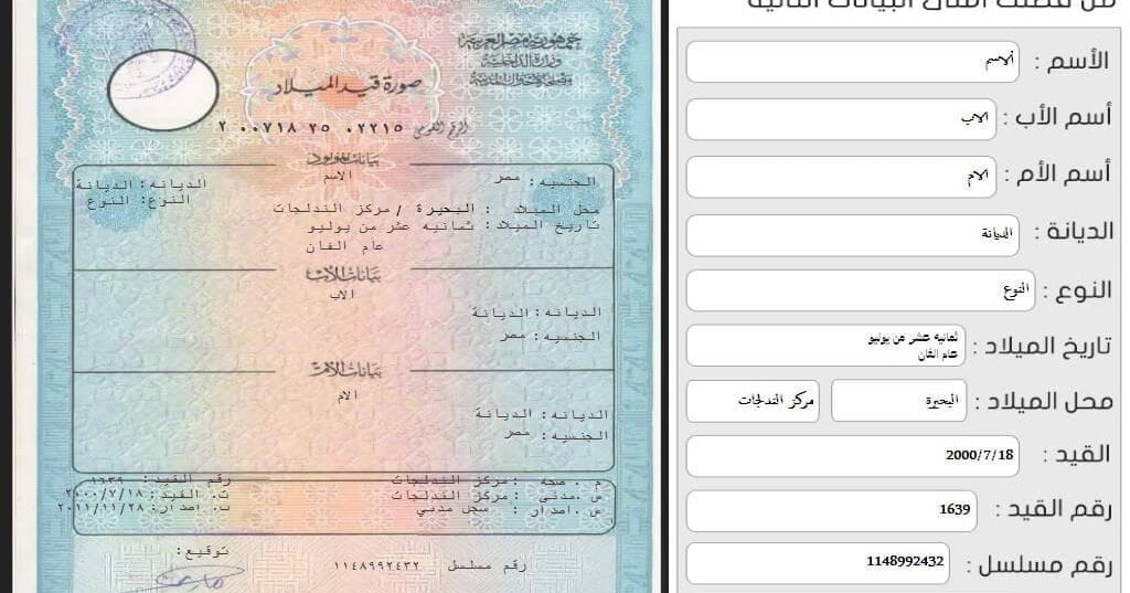 نموذج شهادة ميلاد مصرية باللغة الانجليزية