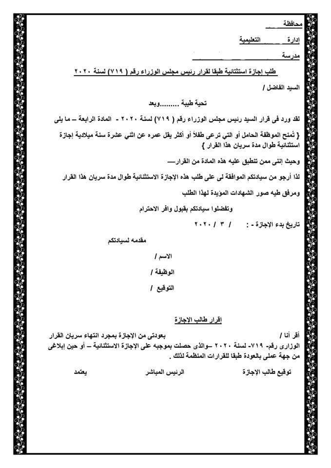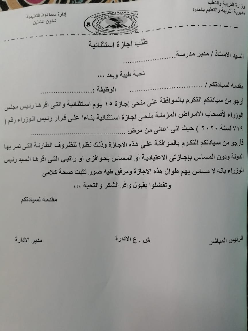 وفقا لقرار رئيس الوزراء ننشر نموذج طلب الحصول على أجازة استثنائية للمعلمين اخبارنا اليوم