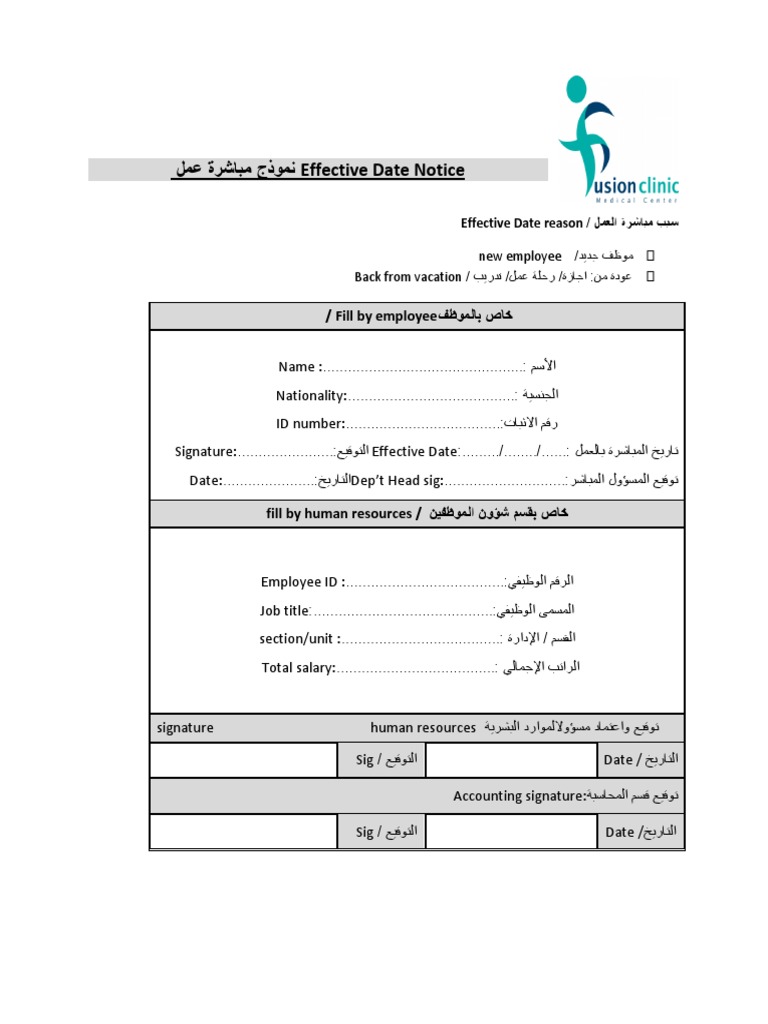 الحقيبة الإدارية نموذج إشعار مباشرة عمل Effective Date Notice