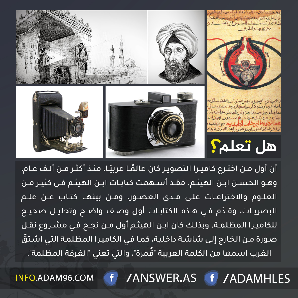 إن المسجد الأقصى يعتبر ثاني بيت وضع من أجل عبادة الله عز وجل على وجه الأرض وهذا بعد أربعون سنة من إرساء قواعد المسجد الحرام ومن المرجح بأن أول من بنى المسجد هو أبينا آدم عليه السلام. هل تعلم أن أكتشف أوتو هان الانشطار النووي عن طريق تقسيم اليورانيوم قبل 60 عاما. هل تعلم أن الانسان ممكن أن يكتسب المال ويفقده ويكتسب القوة ويفقدها ولكن عندما يكتسب العلم فانه لا يفقده. مواضيع ذات صلة بـ.