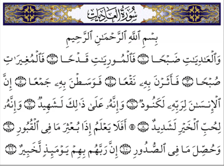 Sami Mansouer Abu Haimed On Twitter سورة العاديات والعاديات ضبحا فالموريات قدحا فالمغيرات صبحا فأثرن به نقعا عن ابن عباس قال نزلت سورة والعاديات بمكة